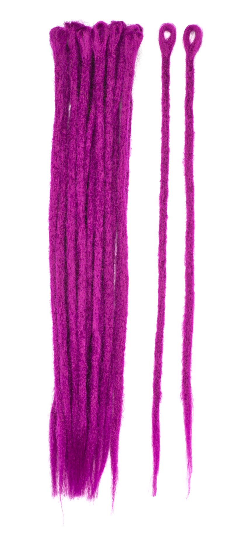 Двойные дреды из искусственных волос, по своему внешнему виду наиболее приближены к натуральным. Крепятся к Вашим волосам с середины длины каждого дреда – таким образом получается сразу два дреда, что дает дополнительный объем. Аккуратный внешний вид, заостренные кончики – можно использовать неоднократно. Простота в уходе: мыть 1-2 раза в неделю шампунем, разбавленным водой, и дать высохнуть естественным способом, без использования фена. Можно носить от 2,5 до 3 месяцев (зависит от скорости роста своих волос), после чего можно снять самому или с помощью мастера, не травмируя собственные волосы. Изготавливаются они из синтетического моноволокна (канекалона).