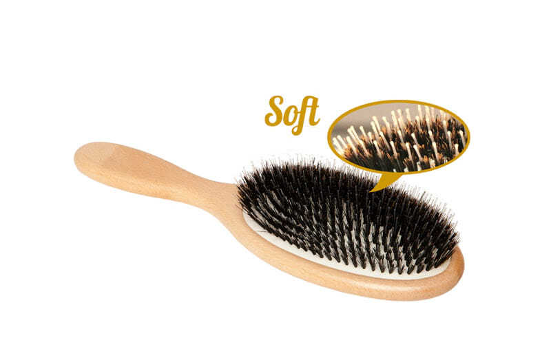 Щетка для наращенных волос мягко расчесывает волосы даже при сильном запутывании благодаря двухуровневой щетине: первый уровень щетины из натурального материала расчесывает и разглаживает первый уровень волос, второй уровень щетины из силиконовых вставок, более длинный и редкий, аккуратно расчесывает прикорневую зону.